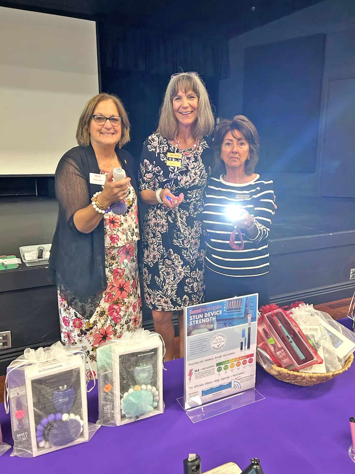 LAURA FOGERTY FROM DAMSELS IN DEFENSE, JANET KERNS, AND MARY LOU PIEROZZI THREATEN AN IMAGINARY ATTACKER WITH THEIR LIGHTED TASERS.