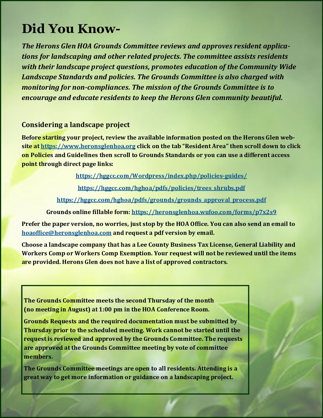 There are several ways that Grounds volunteers may be able to help you. One helpful tool the Grounds Committee offers is a list of Florida Friendly plants that will thrive in your yard with proper care. You can access this on the Web at Herons Glen HOA, under HGHOA/Resident Area/Policies & Guides/Ground Standards/Recommended Trees & Shrubs. When choosing plants for your property, consult the list and you will most likely have fewer problems in having and keeping a beautiful landscape. Another way a committee member might be able to help, is by going over what is required in different areas of your property, such as areas around light posts or partially empty beds. A Grounds Committee member may be able to go over any standards that are not clear to you. While Grounds Committee members cannot recommend landscapers, a neighbor might help in choosing someone to either aid in choosing plants or someone to maintain your landscape.