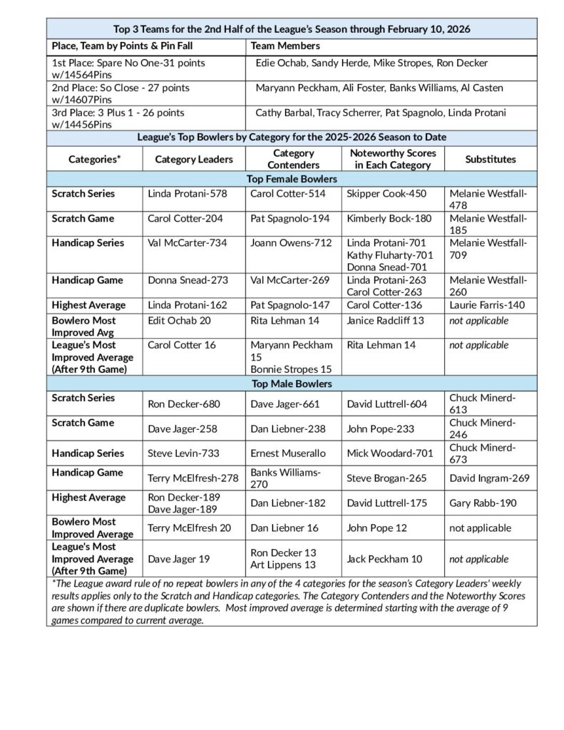 Here are the results of the Herons Glen Mixed Bowling League through February 10, 2026. The team of Spare No One continued their winning ways and is currently leading the League after having won the 1st half of the season.